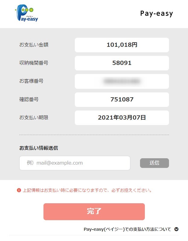 お支払情報のところにメールアドレスを設定しておくと、入金が完了したらメールで送られてきます。