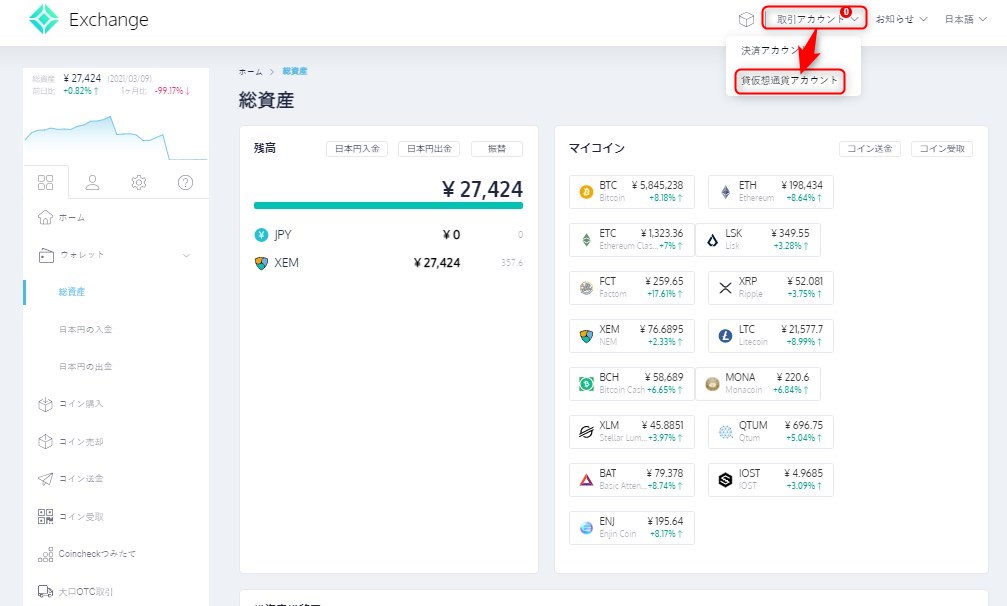 「総資産」から購入した仮想通貨の枚数や金額を確認することができます。購入は以上となります。