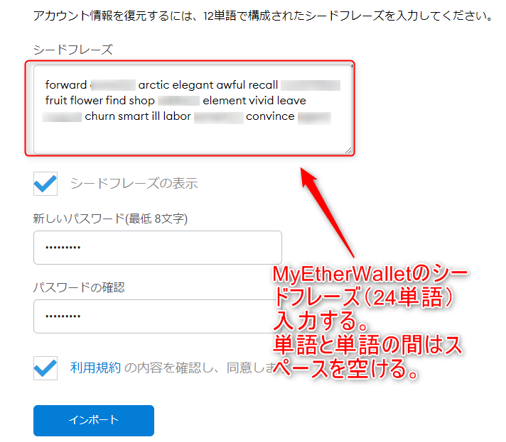 MyEtherWalletの24語キーフレーズ(秘密カギ)を入力します。単語と単語の間はスペースであけてください。