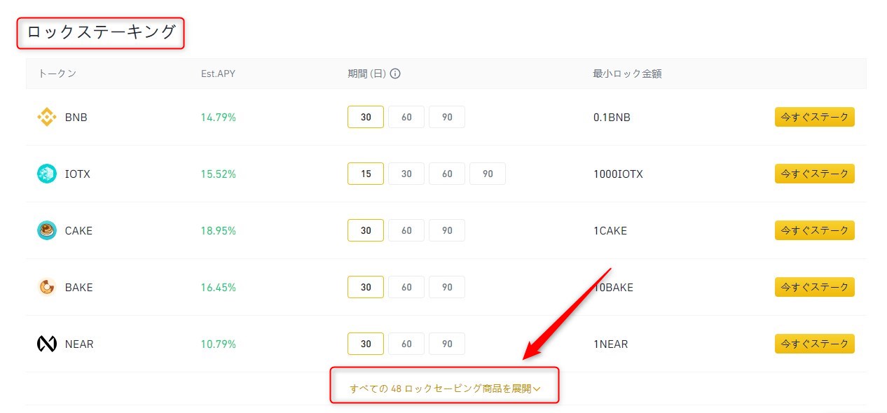ロックステーキングでデフォルトだと一部しか表示されていないため、すべての商品を表示させます。