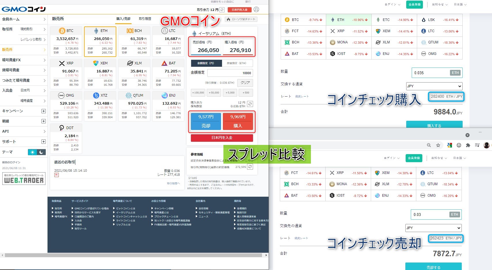 このスプレッドは販売所によって設定されている価格が異なります。GMOコインとコインチェックのスプレッドを比較してみましょう。