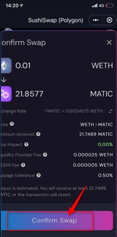 JPYC(Polygon)とガス代分のMaticを手に入れたのを確認したら、Sushi SwapなどでMaticを追加で購入しましょう。Maticがなくなってしまうと取引ができなくなります。