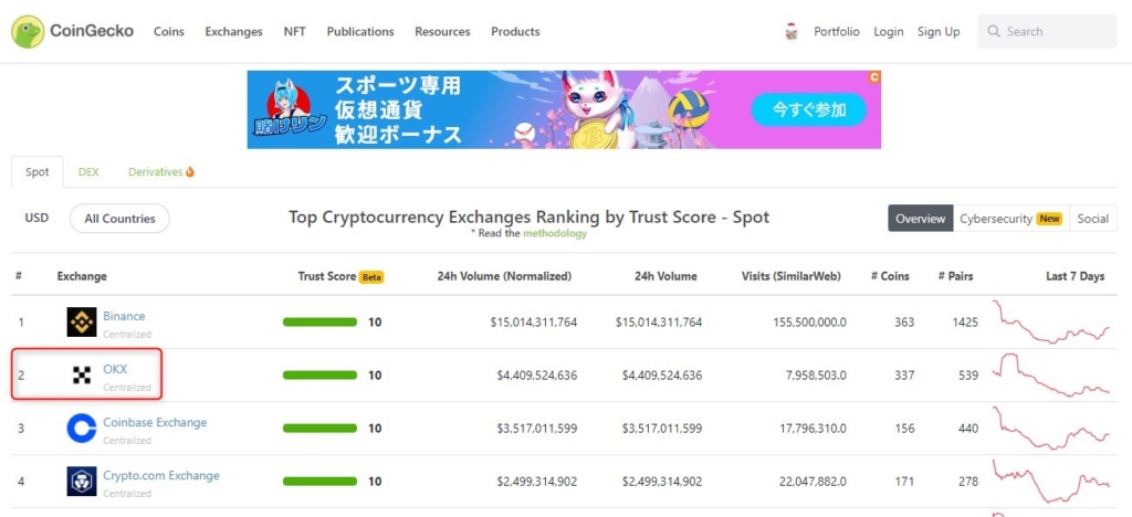 CoinMarketCapでは24時間以内の取引高ランキング「4位」、CoinGeckoでは「2位」となっています。