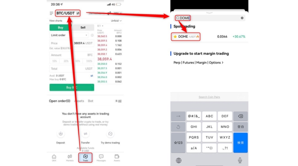 「日本の取引所へ口座開設(コインチェックなど) ⇒ 日本円で仮想通貨XRPを買う ⇒ OKX取引所へXRPを送金 ⇒ OKX取引所でXRPをUSDTに交換し、USDTでDOMEを買う」