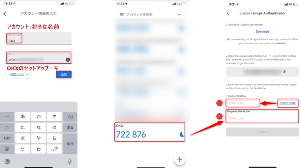 その後OKXアプリに戻り①「Send code」を押してメールアドレス宛てに届いた6桁のコードを入力した後、②2段階認証アプリの6桁のコードを入力し、次の画面に進んでください。これで2段階認証の登録は以上です。