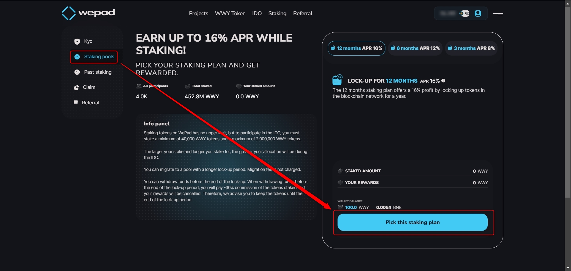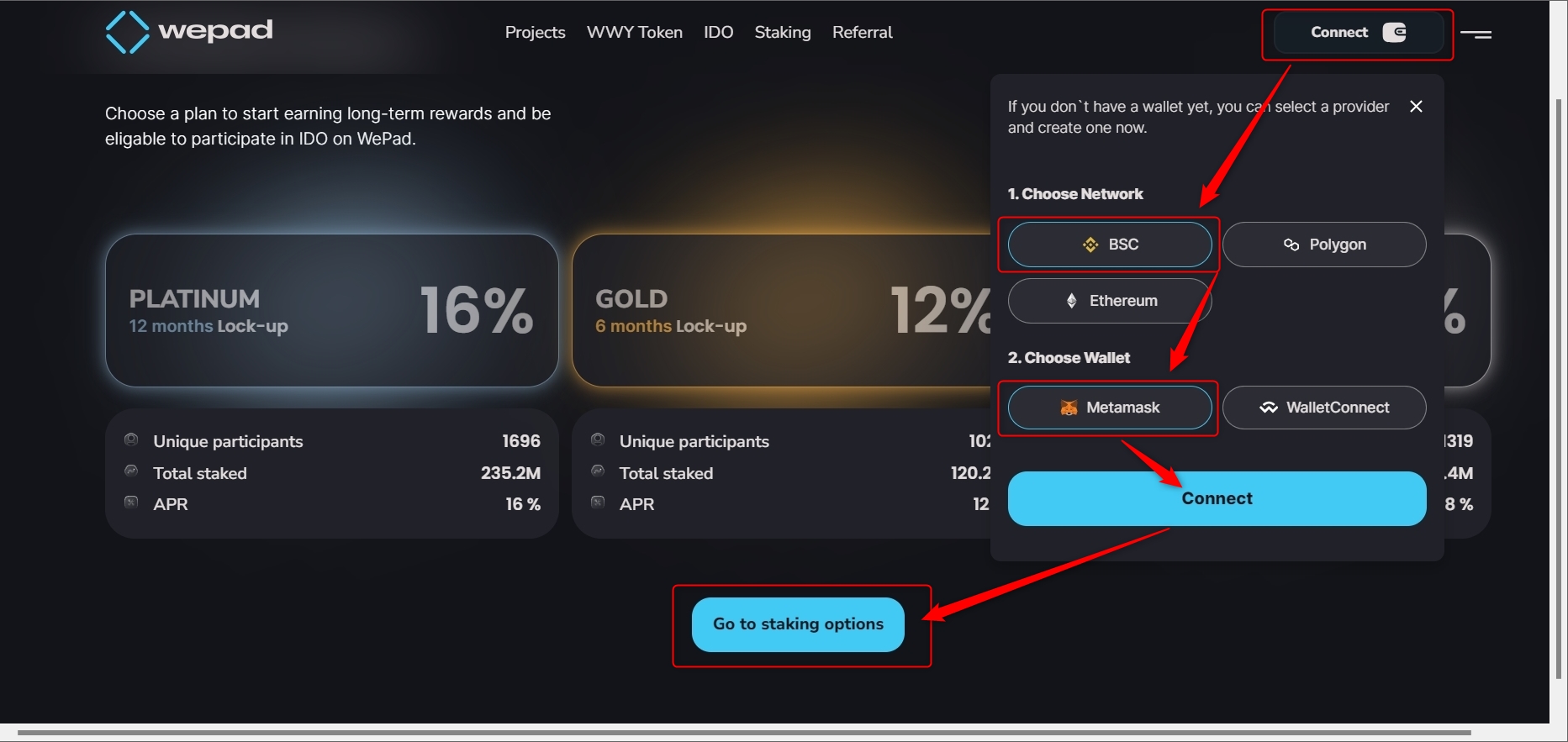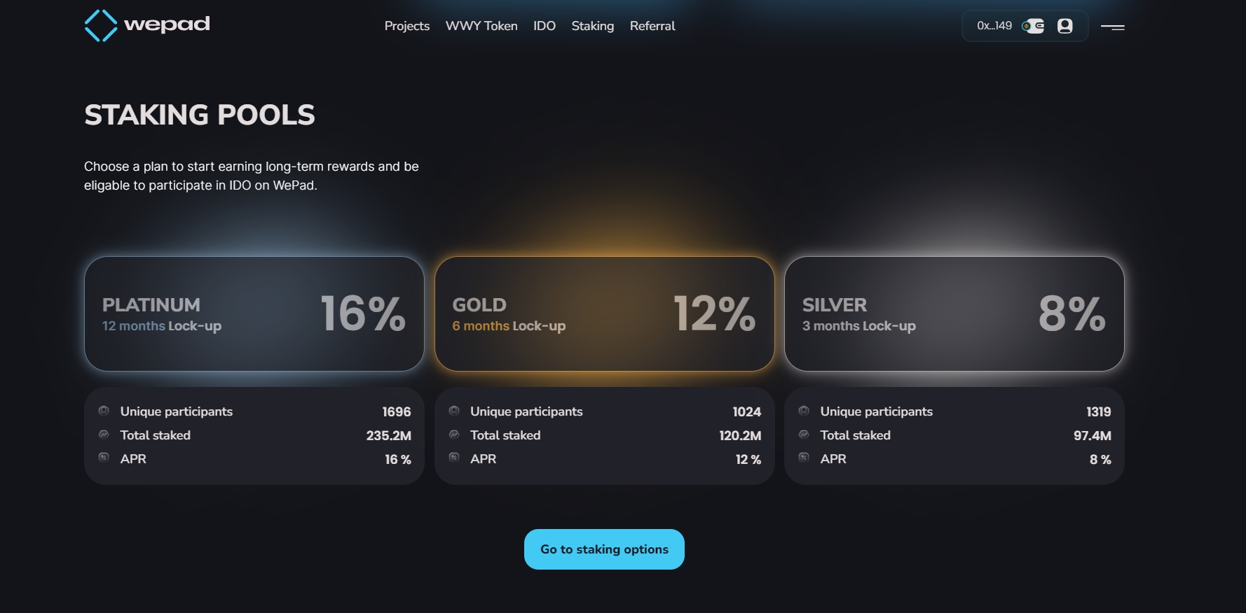 Wepadが発行している「WWY」という通貨を購入し、ステーキングすることで様々なプロジェクトへのIDOに参加することができます。