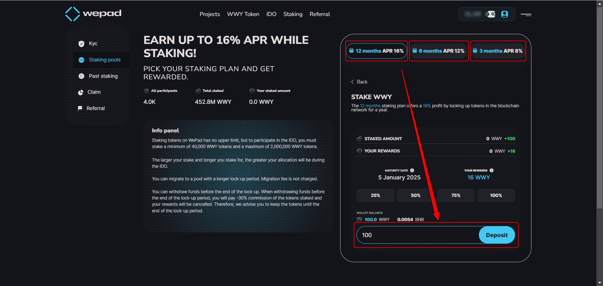 ロックしたい期間「12か月」「6か月」「3か月」のどれかを選択し、預けたいWWYトークンを入力後に「Deposit」を押すとステーキングすることができます。※手数料で少額のBNBが必要です。