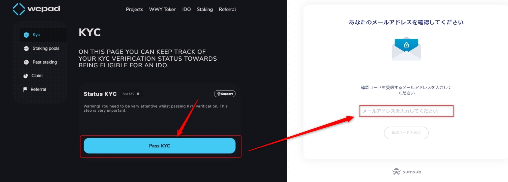Wepad公式サイトでメタマスクウォレットと接続し、KYC(個人情報の登録)行います。