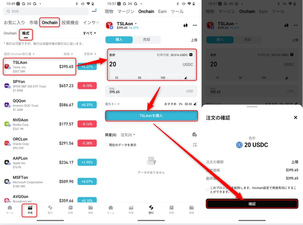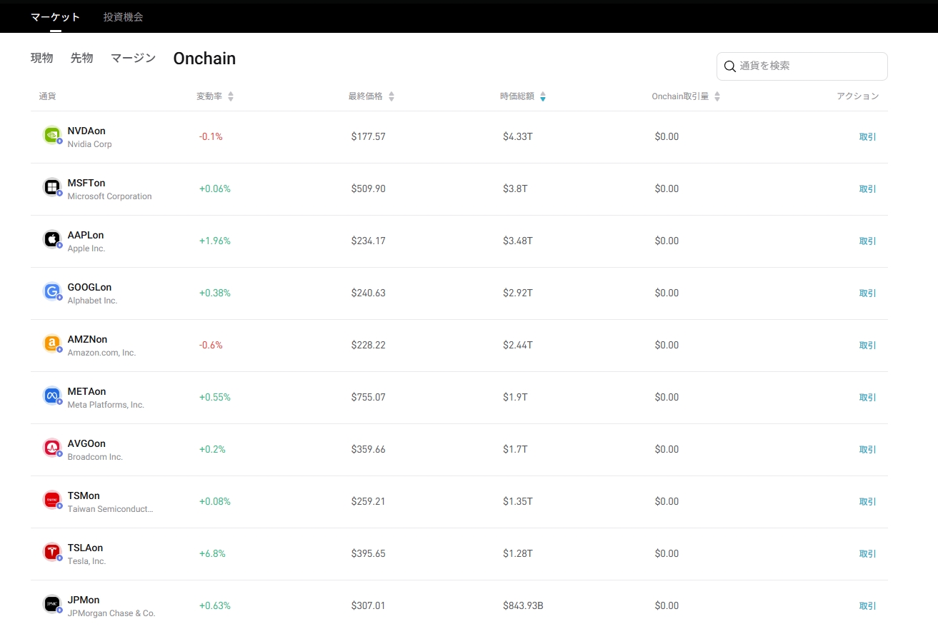 「市場」⇒「Onchain」⇒「株式」でRWA商品を選ぶことができます。