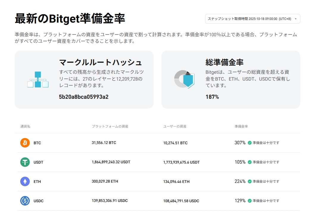 Bitgetは定期的に準備金証明(Proof of Reserve)を公開しており、ユーザー資産の裏付けを完全に開示しています。