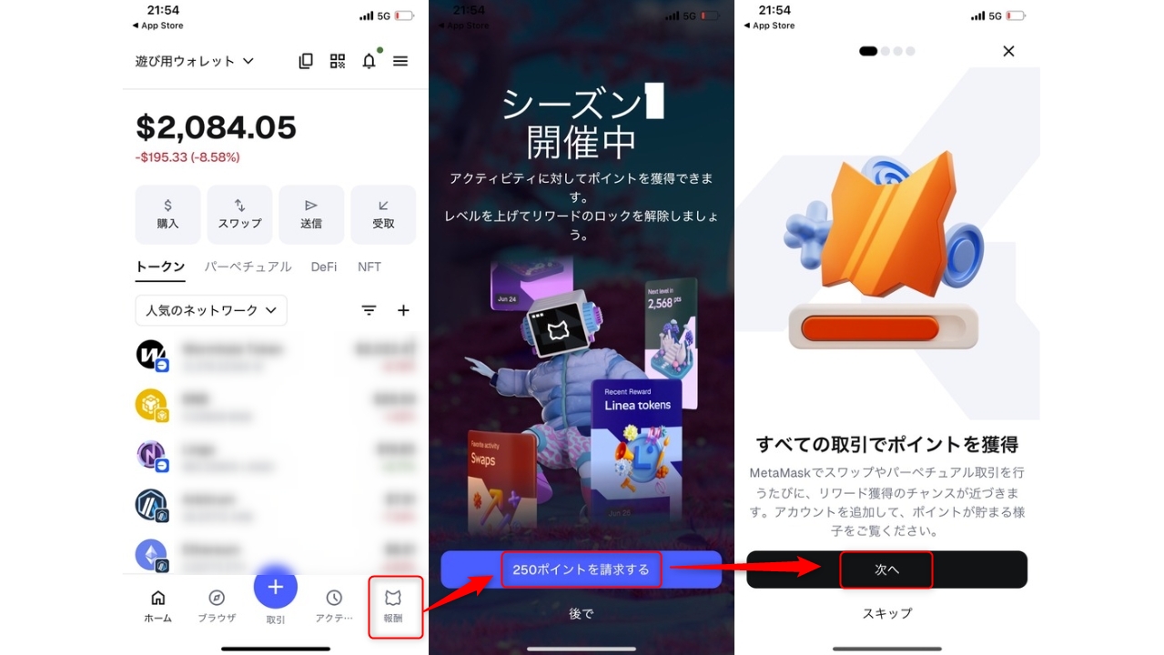 アプリ内の「Rewards(報酬)」タブを開き、ポイントを請求してイベントに参加します。(報酬タブが見当たらない方は、MetaMaskアプリを最新版(v7.57以上)にアップデートしておくこと)