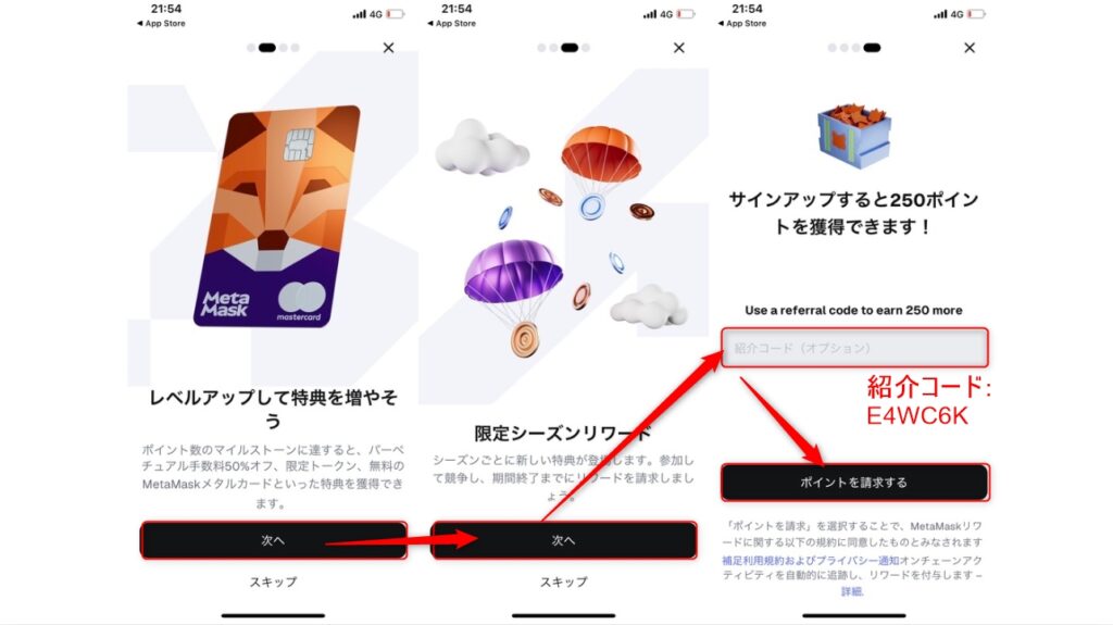 MetaMask Rewardsの参加時に紹介コード E4WC6K を入力すると【250ポイント】がもらえます。(登録後は入力できないため、先に設定しておくのがおすすめです)