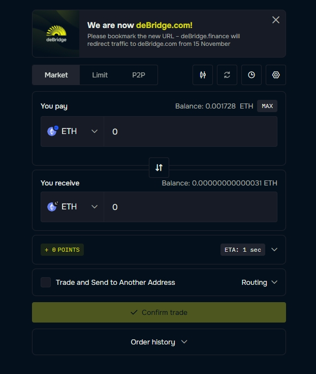 Lineaチェーンで通貨をスワップするには、手数料としてETH(Liena)が必要となります。DeBridgeを使用すれば瞬時に、異なるネットワークETHをブリッジできるのでお勧めです。